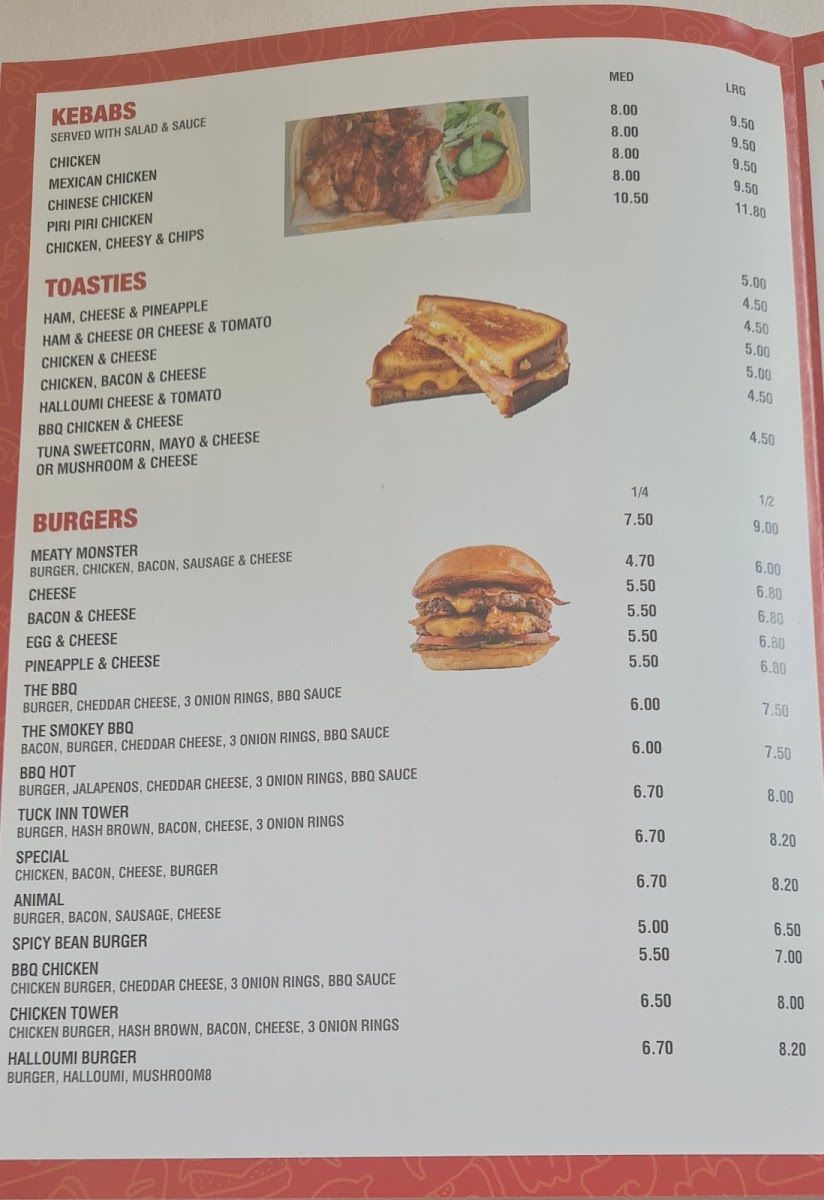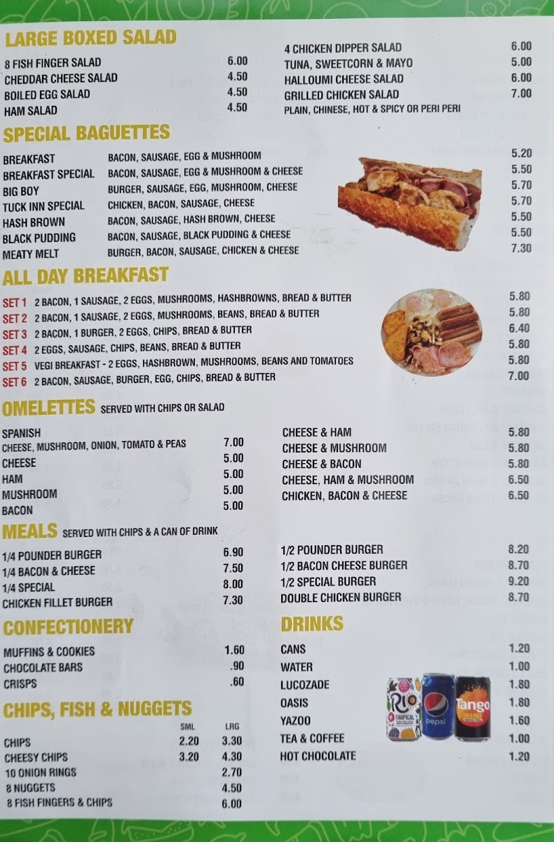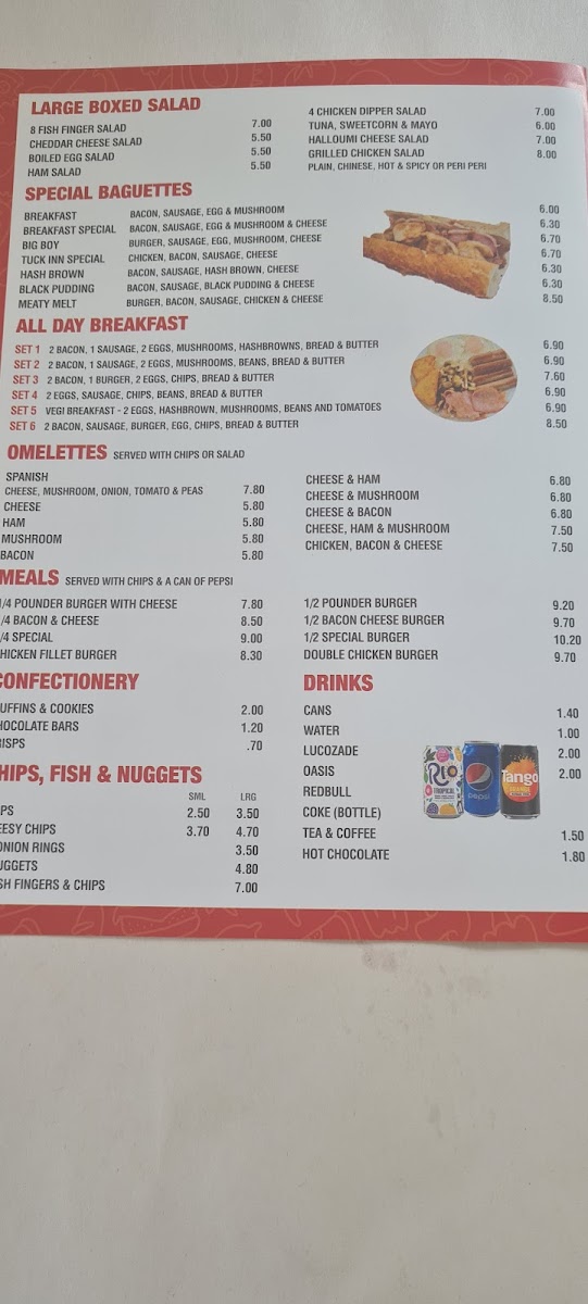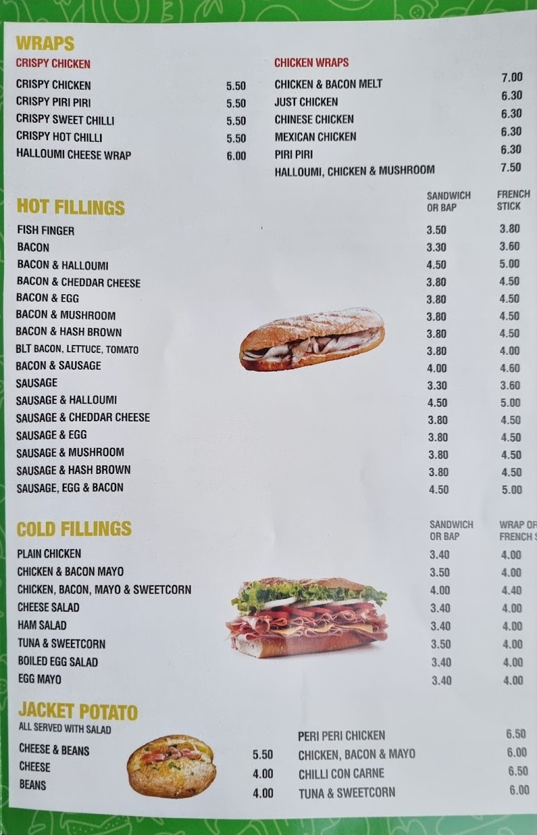 The menu is suitable for customers seeking quick order options or light casual dining. It covers breakfast and daytime meals featuring a mix of hot and cold items, emphasizing flexibility in portion sizes and fillings.